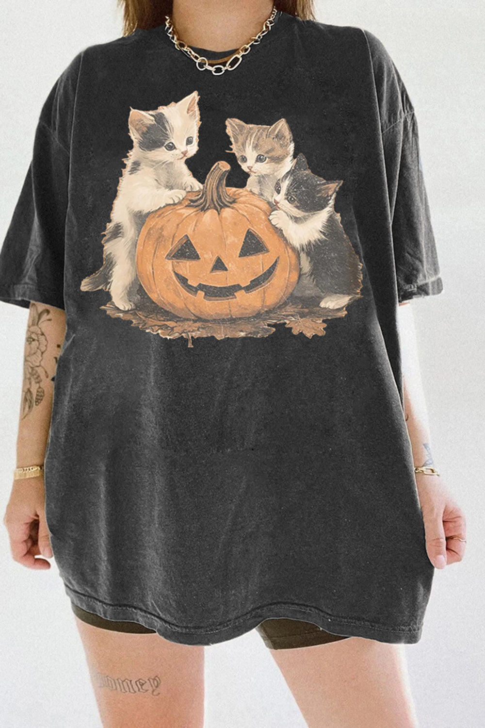 Vintage 90s Pumpkin Cat Halloween Tee For Women