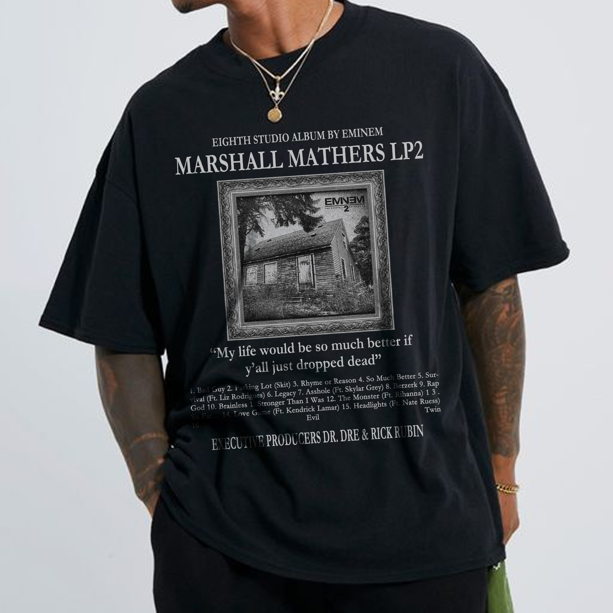 The design of this T-shirt is directly inspired by Eminem's album "The Marshall Mathers LP 2", which was released in 2013 and received widespread acclaim. The album explores personal struggles, psychological struggles and social issues. The design of the T-shirt may be printed with the album cover, classic lyrics or visual elements related to the album, allowing the wearer to intuitively express their love for Eminem.